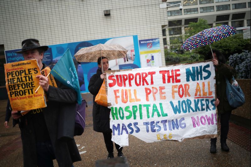 People protest against the lack of personal protective equipment (PPE) outside of St Thomas' Hospital, following the outbreak of the coronavirus disease (COVID-19), London, Britain, April 28, 2020. REUTERS/Hann
