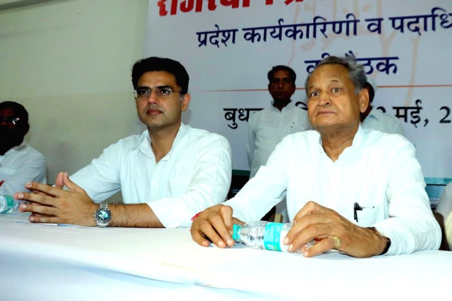Rajasthan Chief Minister Ashok Gehlot and Deputy Chief Minister Sachin Pilot during a Congress committee meeting at the party office in Jaipur on May 29, 2019. (IANS File Photo)