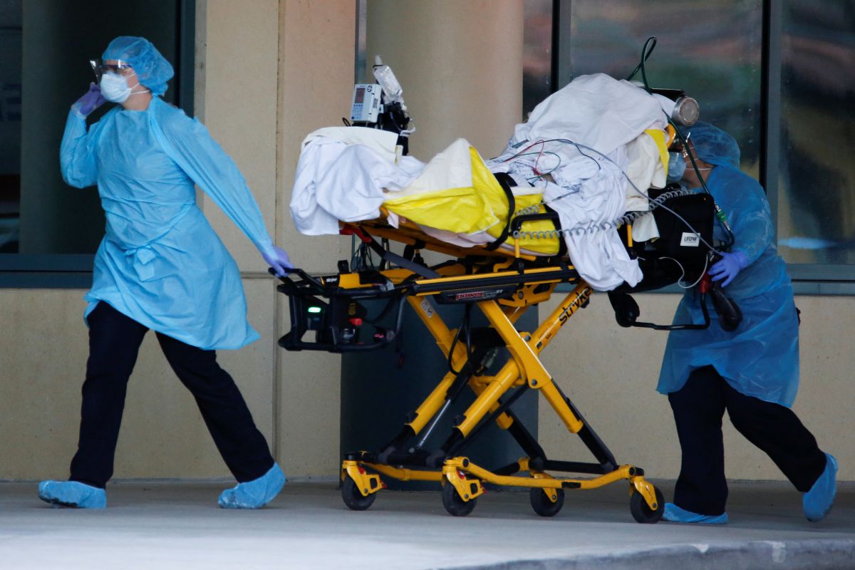 Rescue workers push a stretcher with a patient from the Zaandam of the Holland America Line cruise ship, afflicted with coronavirus disease (COVID-19), at Broward Heatlh Medical Center in Fort Lauderdale, Flori