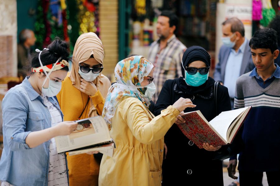 Iraqi women wear protective face masks, following an outbreak of coronavirus, as they read books at Mutanabbi Street in Baghdad, Iraq on March 6, 2020. (REUTERS Photo)