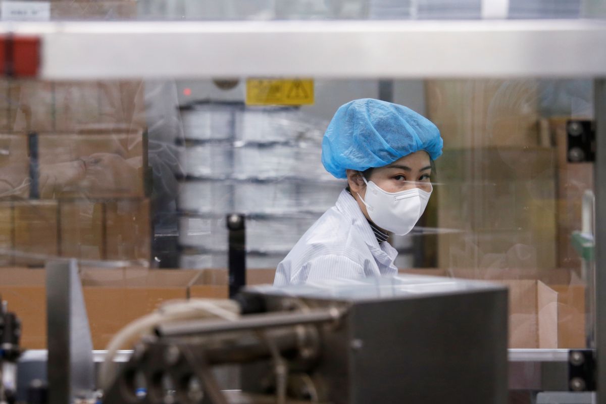 An employee works in an assembly line at a mask factory in Icheon, South Korea, March 6, 2020. REUTERS/Heo Ran