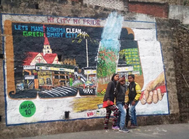 MY CITY, MY PRIDE: Three kids take selfies in front of the wall painting in Ward 10, Kohima.