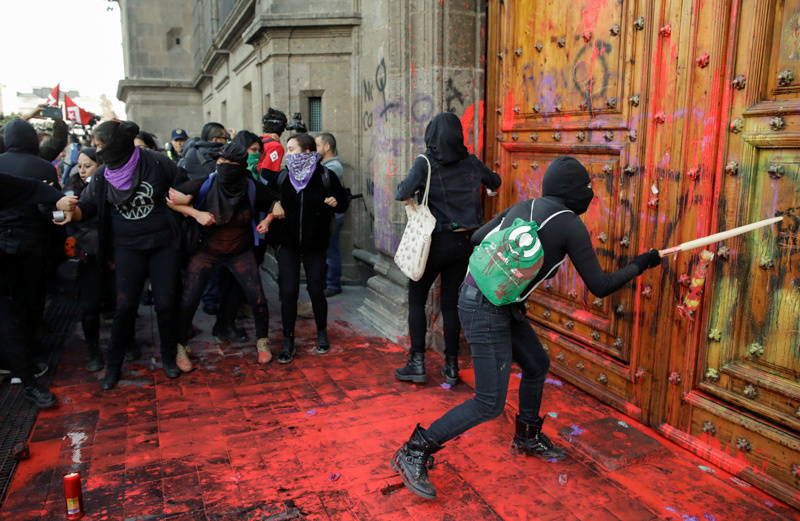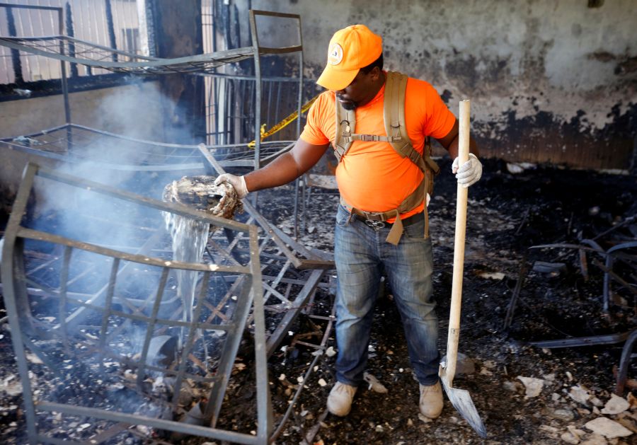 A civil protection worker pours water over burning debris inside a bedroom at an orphanage after it was destroyed in a fire, in Port-au-Prince, Haiti on February 14. (REUTERS Photo)