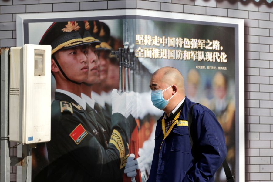 A man wearing a mask walks past a military poster at the Financial Street in central Beijing, China, as the country is hit by an outbreak of the new coronavirus, February 3, 2020. REUTERS/Jason Lee