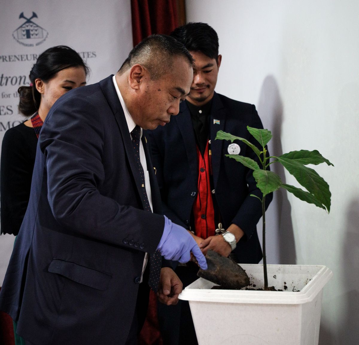 Neiba Kronu, Minister of Planning & Co-ordination, Land Revenues & Parliamentary Affairs planting a sapling during the launch event.(Photo Courtesy: EA)