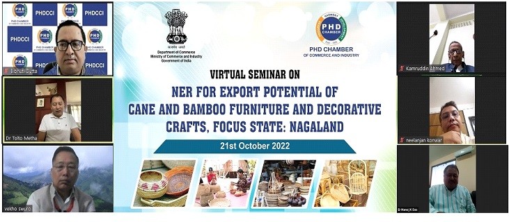 Dimapur, October 24 (MExN): The NER Chapter of PHD Chamber of Commerce and Industry, in association with Department of Commerce, Ministry of Commerce & Industry, Government of India organized a virtual seminar on ‘NER for export potential of cane and bamboo furniture and decorative crafts, focus state: Nagaland’ under capacity building programme initiative on October 21.