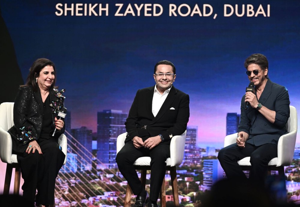 Mumbai: Film director and choreographer Farah Khan, Actor and film producer Shah Rukh Khan and entrepreneur Rizwan Sajan during an announcement event by Danube Properties in Mumbai, Friday, November 14, 2025. (Photo: IANS)
