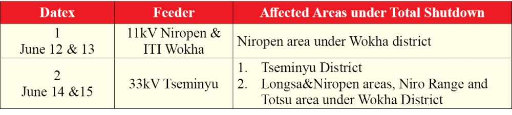 Kohima, June 11 (MExN): There will be a complete shutdown of power supply to some parts of Wokha district on June 12 and 13, as well as Tseminyu district and some areas in Wokha on June 14 and 15.