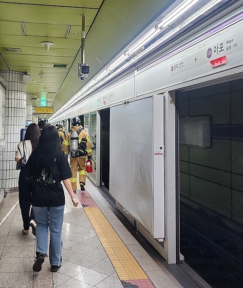 Police found the suspect had a lot of soot on his hands when he was carried out on a stretcher from the platform at Yeouinaru Station. He was apprehended at the scene at 9:45 a.m. after admitting to the alleged arson during police questioning.