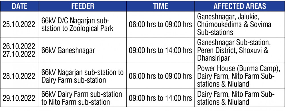 Informing this in a press release, the EE informed that the exercise would be carried out from October 25 to 29 and would affect consumers in Dimapur, Chümoukedima, Niuland and Peren districts. (See Table)