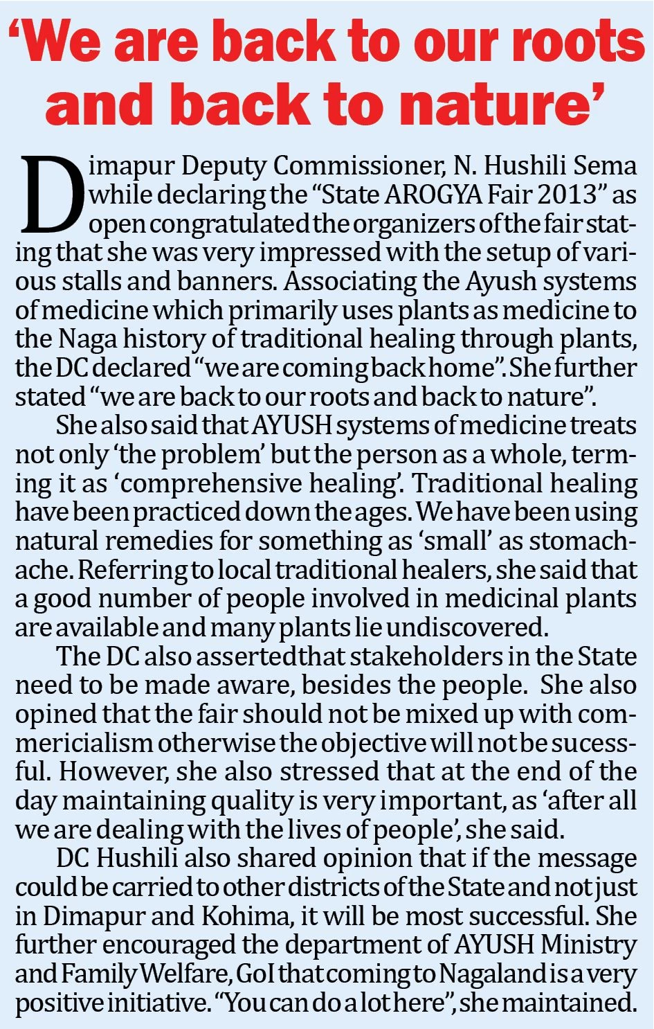 Earlier, welcome address was given by Dr. Sukhato Sema, CMO, Dimapur. An overview of the ‘AROGYA fair’ was also presented by Team Leader, Department AYUSH, MOH & FW, GOI. A yoga demonstration was also held during the function and performance by Kenie Chale, Naga Idol finalist. Dr. Ditsolo Mero, MS, Dimapur DH, also stated vote of thanks.