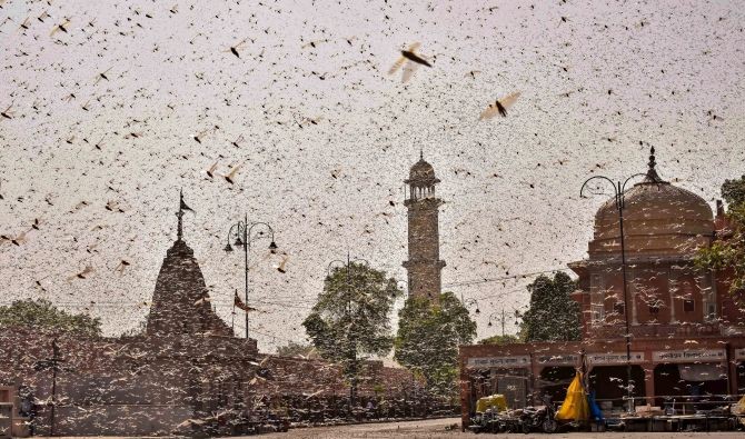 Swarms of locust in the walled city of Jaipur, Rajasthan, Monday, May 25, 2020. More than half of Rajasthan’s 33 districts are affected by invasion by these crop-munching insects. (PTI Photo