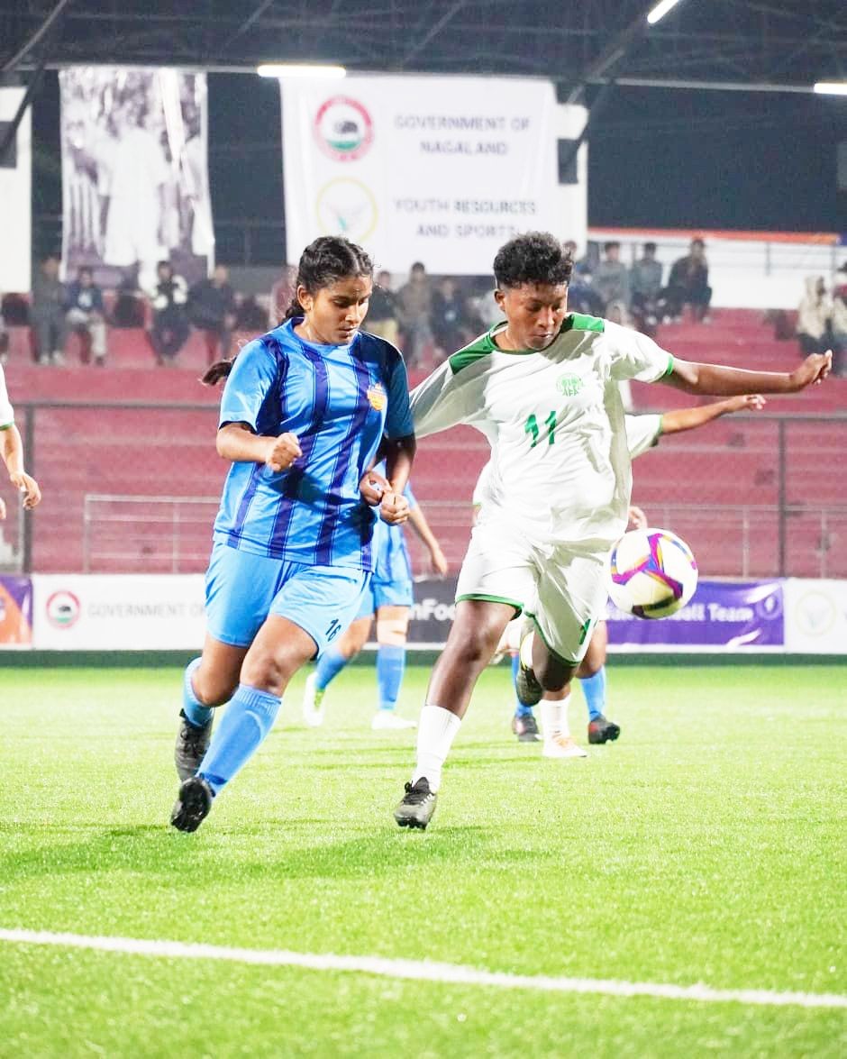 An Assam player (white) vies for possession against Chandigarh (blue) in the Dr. Talimeren Ao Junior Girls’ National Football Championship 2025–26 (Tier 2) at Chümoukedima Football Stadium, Chümoukedima, on December 2.