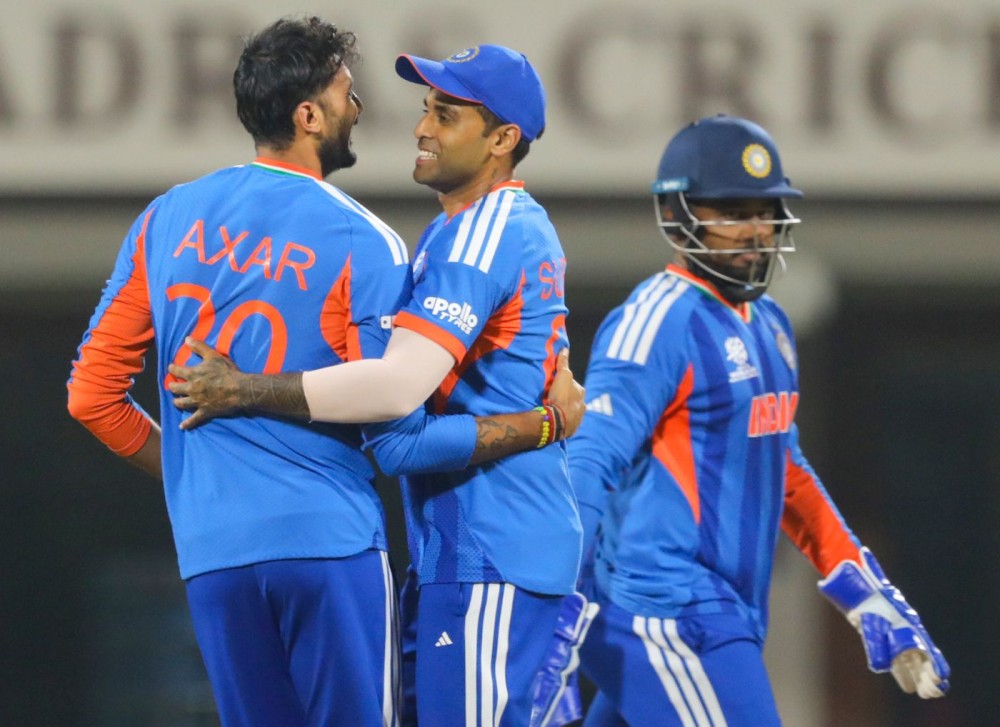 Chennai: India's Axar Patel celebrates with captain Suryakumar Yadav after the dismissal of Zimbabwe's Tadiwanashe Marumani during the ICC Men's T20 World Cup 2026 Super 8 Group 1 match between India and Zimbabwe at the MA Chidambaram Stadium in Chennai, Thursday, February 26, 2026. (IANS)