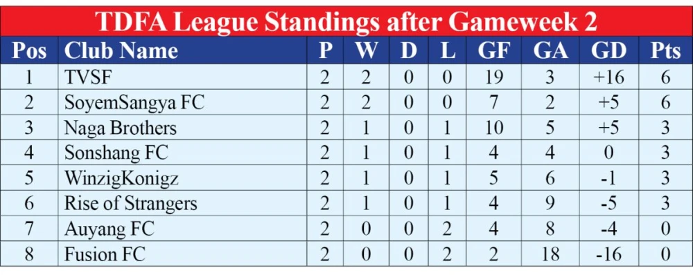 Soyem Sangya FC and Tuensang Village Sports Foundation (TVSF) strengthened their unbeaten streaks with commanding victories on Matchday 4 of the TDFA League, topping the table after two rounds of play.