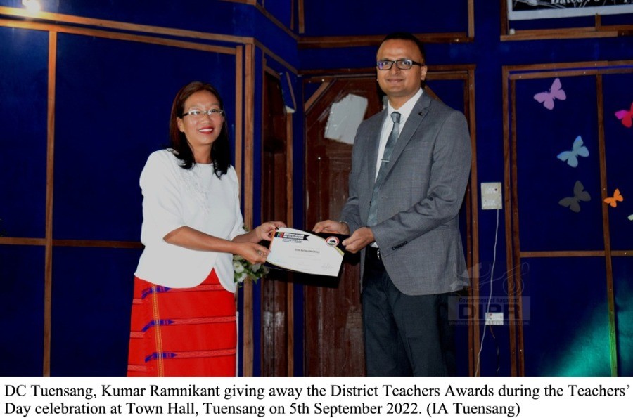 Kiphire District Teachers felicitation of Teacher's award 2022 for meritorious service rendered towards the students’ community was awarded to three teacher: Samuel PGT (History) GHSS; Mhomo GT, GHS, Yangphi and S Tethsomong Sangtam, PT, GMS Sangphure.