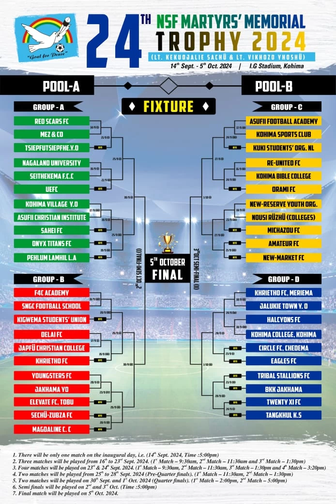 Kohima September 11 (MExN): The technical briefing for the upcoming 24th NSF Martyrs’ Memorial Trophy 2024 will take place on September 12 at 2:00 PM at Indira Gandhi Stadium, Kohima. Altogether, 43 teams will vie for championship, starting from September 14 at Indira Gandhi Stadium Kohima under the theme “Goal for Peace.”