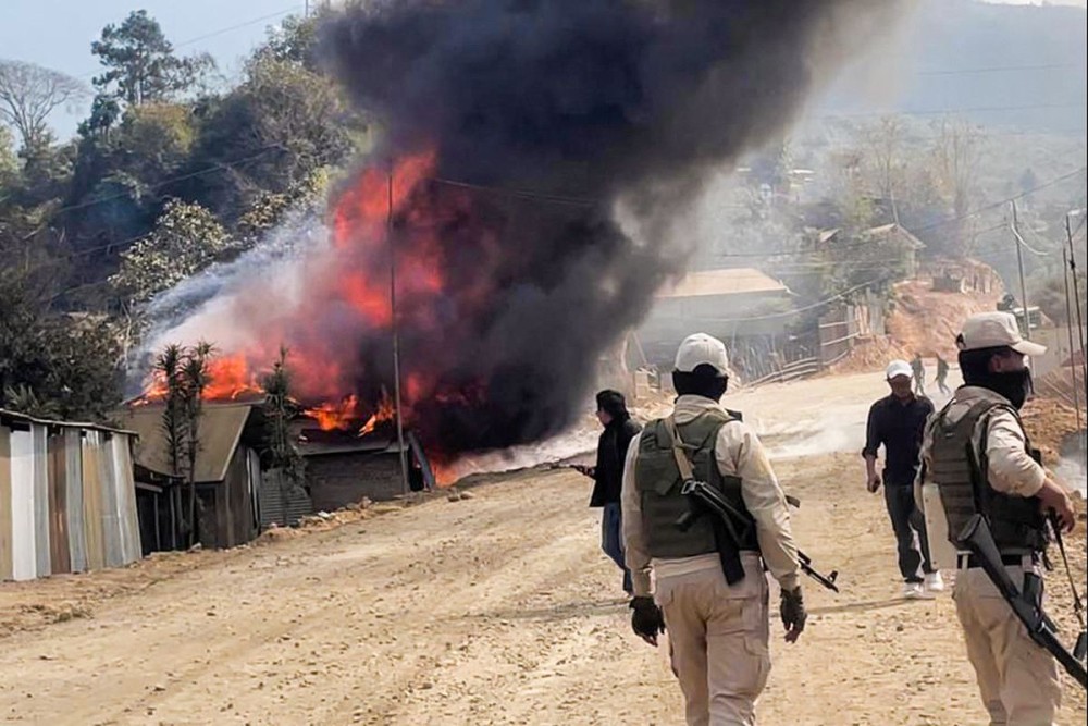 Ukhrul: Security forces stand guard in Litan village following violence between the Kuki and Tangkhul communities in which at least 21 houses were burnt, in Ukhrul district on Monday, February 9, 2026. (Photo: IANS)