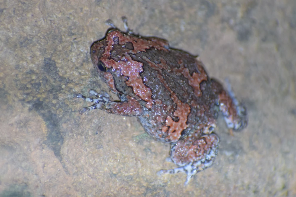 The Assam Painted Frog (Uperodon taprobanicus) is one of the most unusual amphibians in the area because of its bright colours and strange mating calls. This frog makes a common mating call by whistling like a flute instead of making the low throat noises that most other frogs do. The calls are said to sound like insects to scare off predators without giving away their location, which leaves the door open for potential mates.