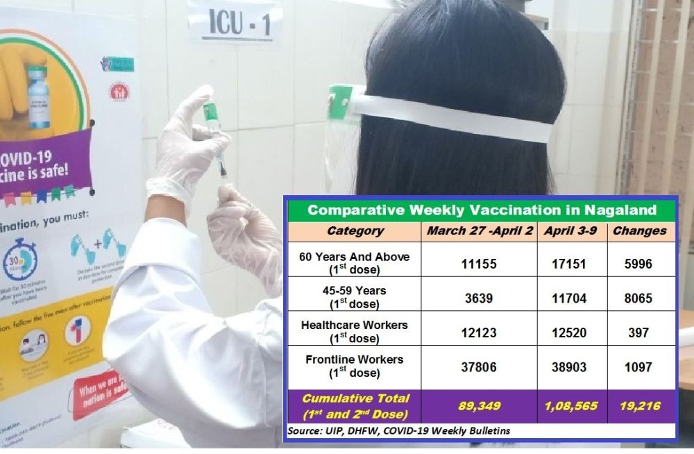 A total of 19,216 doses were administered during the period as against 8,080 last week, taking the total cumulative dosages (1st and 2nd doses) from 89,349 (March 27-April 2) to 1, 08,565 (April 3-9), as per the April 10 Weekly Bulletin issued by State IDSP (Integrated Disease Surveillance Programme).