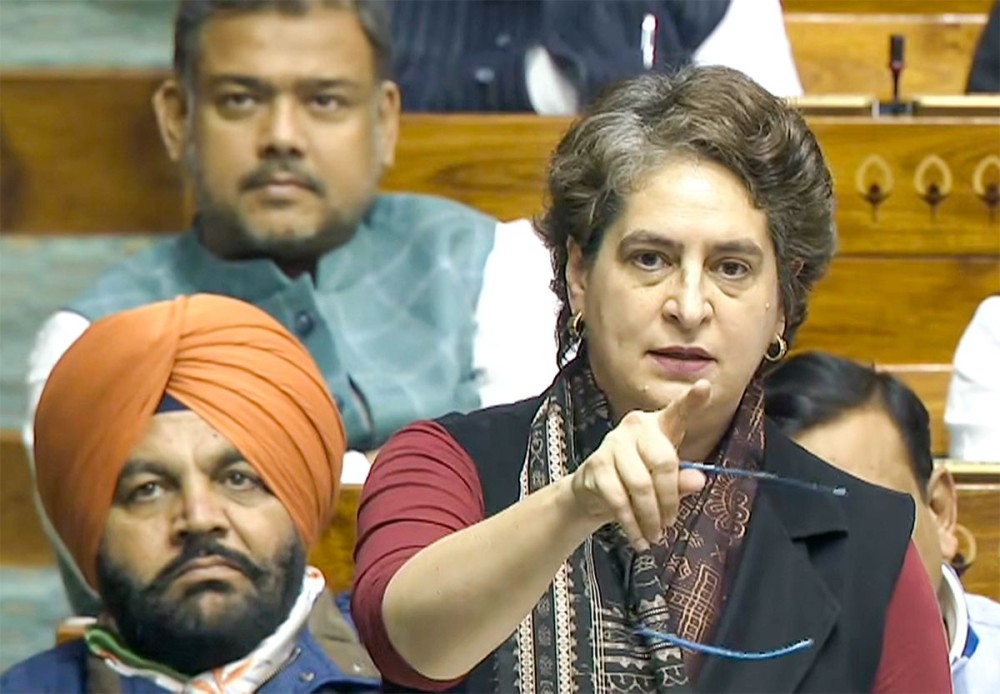 New Delhi: Congress MP Priyanka Gandhi speaks in the Lok Sabha during the winter session of Parliament in New Delhi on Monday, December 08, 2025. (Photo: IANS/Video Grab/Sansad TV)