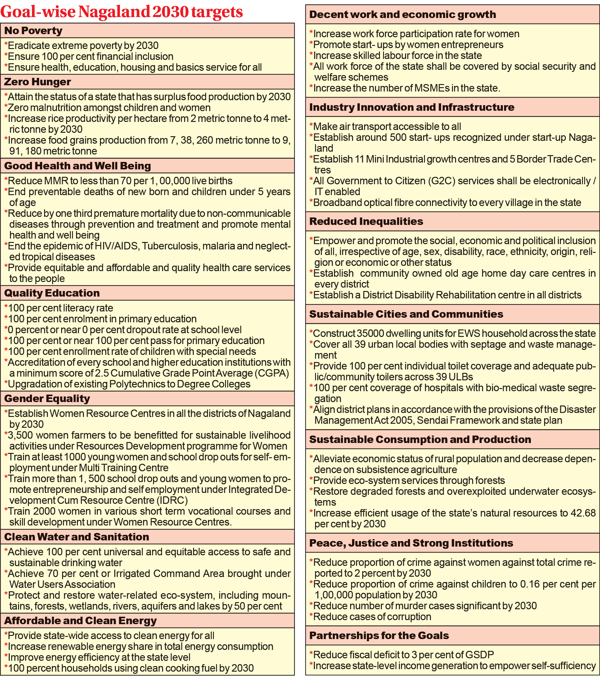 Rio said that the 17 goals and the 169 targets for sustainable development documented in the 'Nagaland SDG Vision 2030' are aligned to the United Nations Sustainable Development Goals – a universal call to action to end poverty, protect the planet and to ensure that everyone enjoys peace and prosperity.