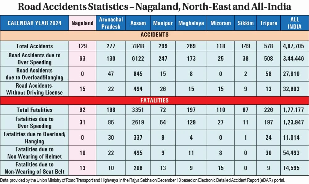 Despite recording one of the lowest numbers of road accident fatalities in the country, Nagaland’s 2024 road safety data show that overspeeding and non-compliance with basic safety norms such as wearing helmets and seat belts were responsible for a disproportionately high share of deaths.