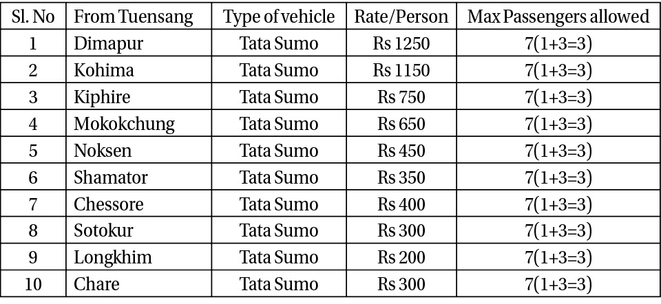 TUENSANG, AUGUST 27 (MExN): Deputy Commissioner, Tuensang, Lithrongla Tongpi Rutsa (NCS)-has issued an order in pursuance of meeting of the Regional Transport Authority, Tuensang held on August 21 on revision of the rate of all passengers vehicles playing from Tuensang HQ to various district /sub-division.