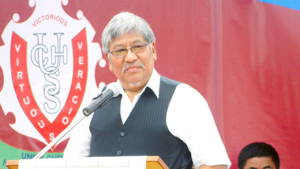 Dr Nicky Kire addressing the gathering at the inaugural function of the new school building at UCHSS, Diphupar on May 4. (Morung Photo)