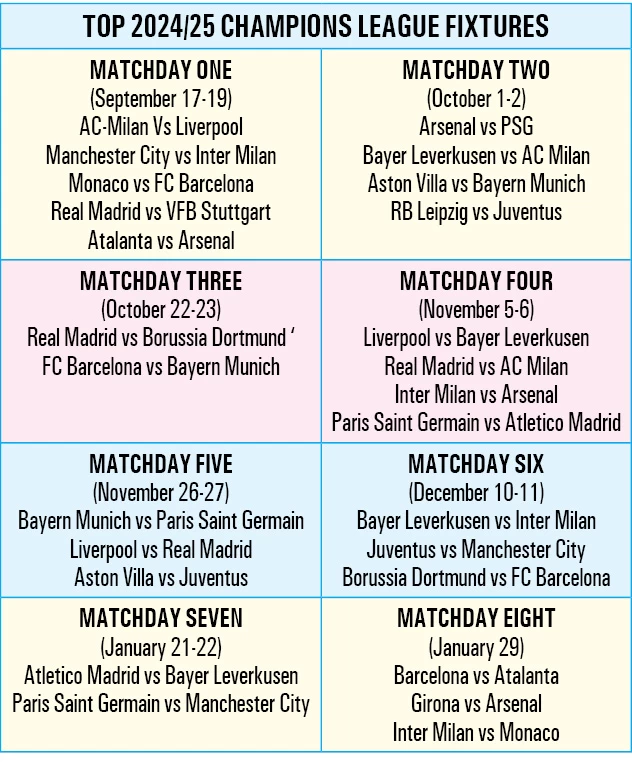 New Delhi, August 31 (IANS): UEFA announced the schedule for the 2024/25 Champions League following the draw that took place on Thursday.