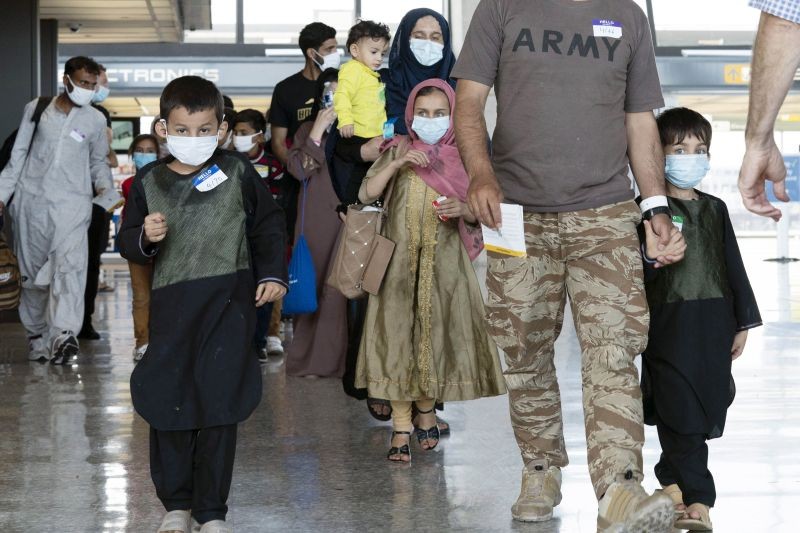 Families evacuated from Kabul, Afghanistan, walk through the terminal before boarding a bus after they arrived at Washington Dulles International Airport, in Chantilly, Va., on Thursday, Aug. 26, 2021. (AP/PTI Photo)