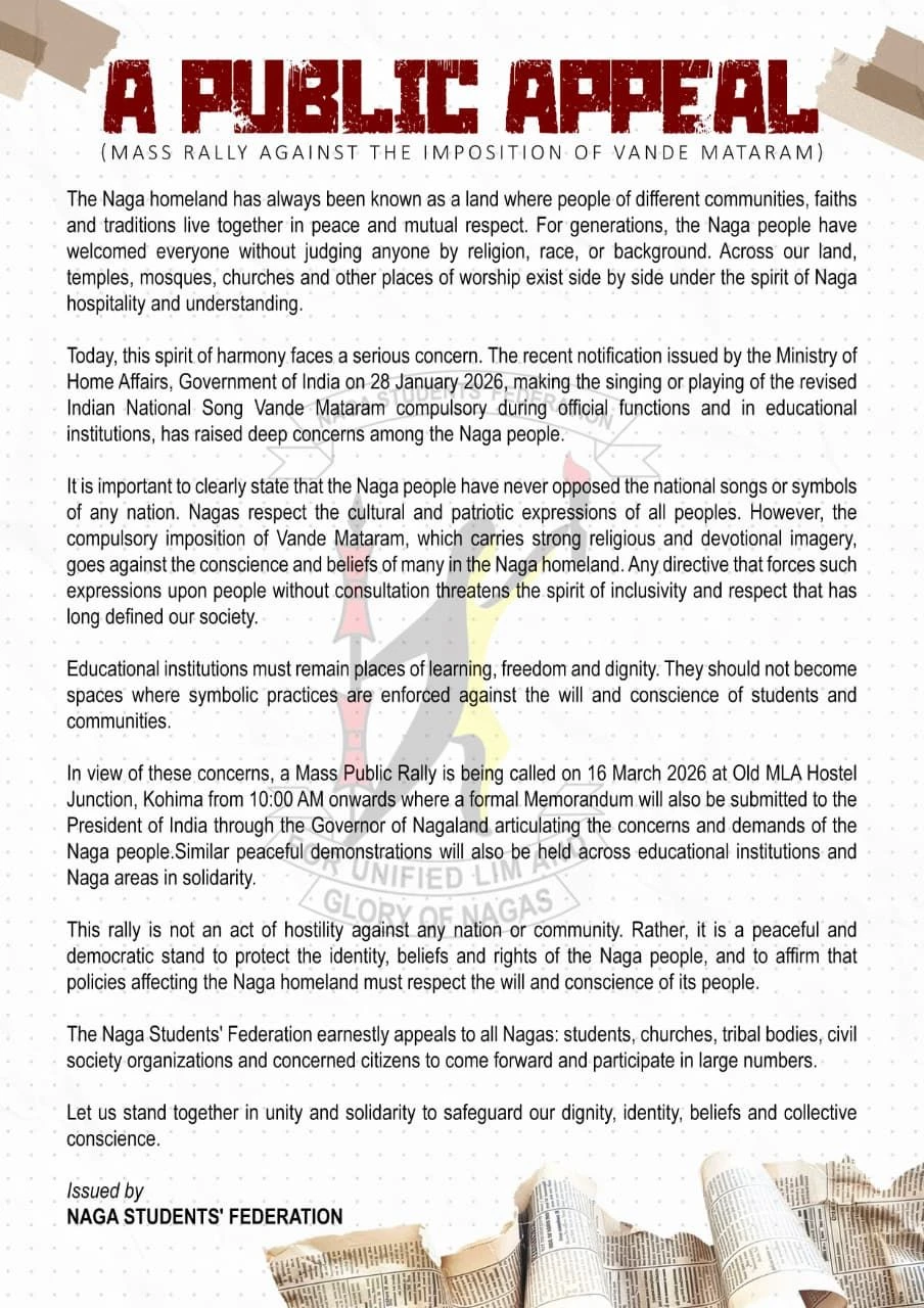 Kohima, March 13 (MExN): The Naga Students’ Federation (NSF) has announced it will organise a mass public rally in Kohima on March 16 to protest the central government’s recent directive making the singing of the revised national song, ‘Vande Mataram’, compulsory at official functions and educational institutions.