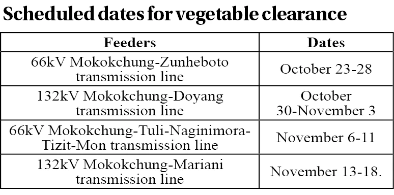 DIMAPUR, OCTOBER 17 (MExN): Vegetation clearance for 132kV and 66kV transmission lines under Transmission Division Mokokchung is scheduled from October 23-November 18.