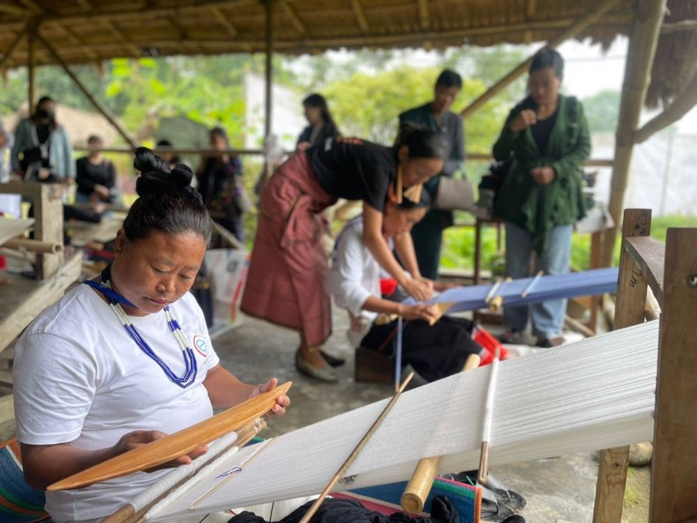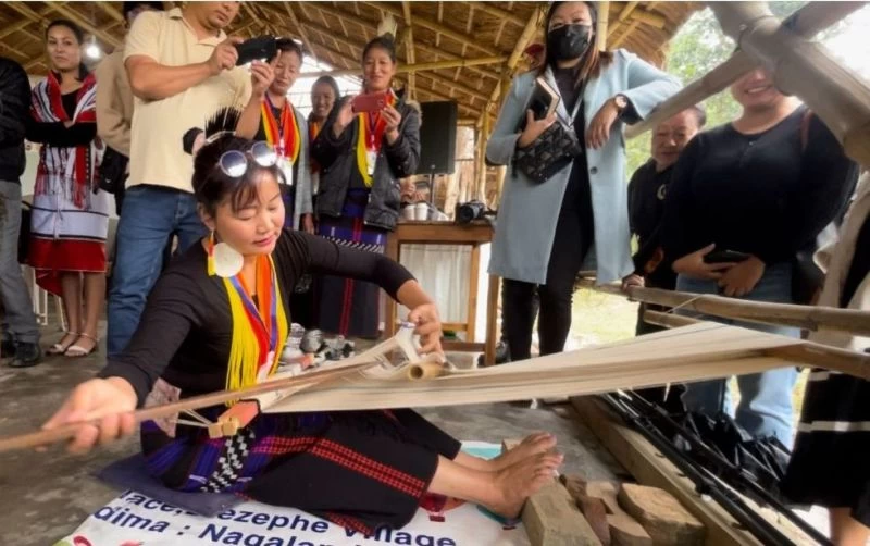 A participant (winner) inspects her wooden beater during a weaving competition on the second day of the 9th Naga Loin Loom Festival in Diezephe village on December 7th, as a supervisor prepares another contestant.