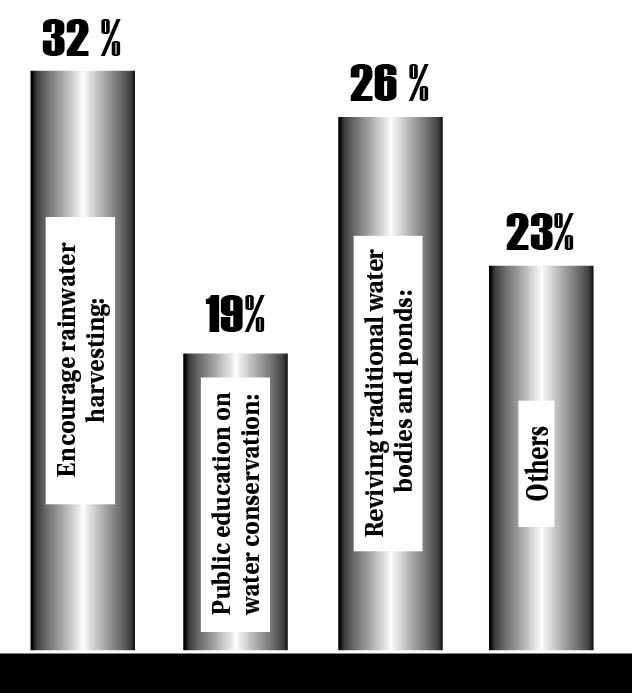• The best option would be to harvest rainwater to the maximum. Also recharge the aquifer level by harvesting rainwater from maximum standing buildings including government infrastructure so as to raise the underground water table.