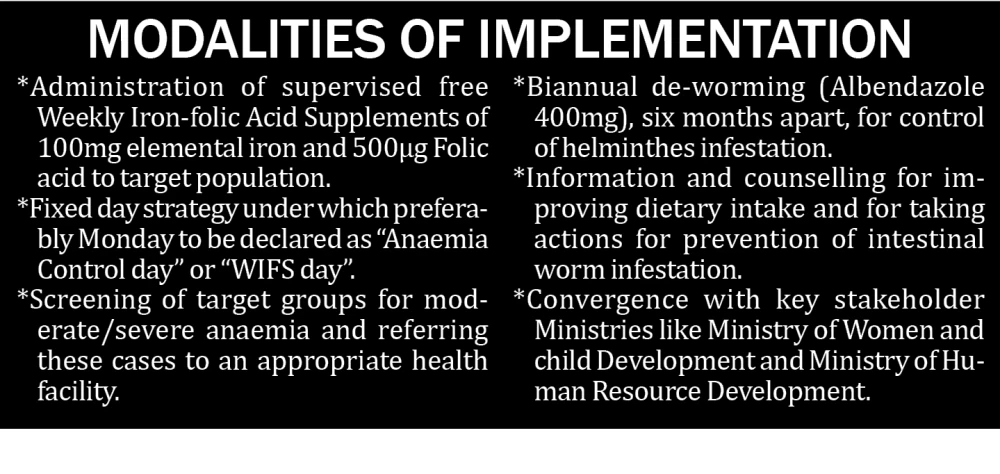 WIFS programme is based on the empirical evidence that weekly supplementation of 100mg Iron and 500µg Folic acid is effective in decreasing prevalence of anaemia in adolescent age group. The programme is free of cost and Iron and Folic Acid deworming tablet, along with testing and counselling services would be provided completely free.