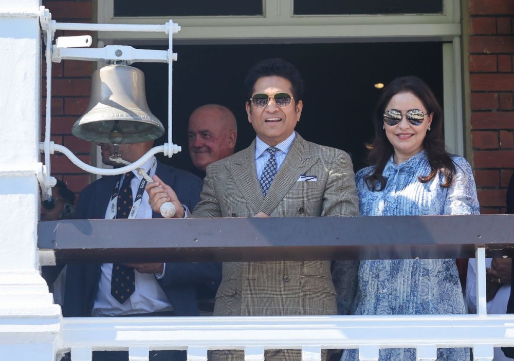 London: Cricket Legend Sachin Tendulkar rings the bell ahead of the 3rd test match between India and England, at Lord's, in London on Thursday, July 30, 2025. His wife Anjali Tendulkar is also present. (Photo: IANS/Pankaj Nangia)