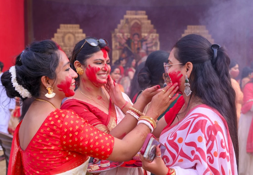 Women celebrate ‘Sindoor Khela’ on Vijayadashami marking conclusion of Durga Puja