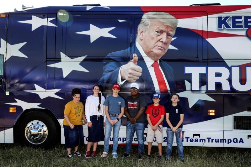 Supporters of U.S. President Donald Trump pose for photos in front of a bus with his image on it as they gather outside his campaign event in Macon, Georgia, U.S., October 16, 2020. (REUTERS Photo)
