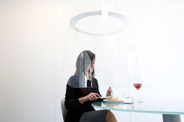 For restaurant owners worrying how they can welcome back customers but keep them safe from COVID-19, a French designer has created a cylinder of transparent plastic that hangs from a cable on the ceiling, much like a lampshade. A scoop cut out of the back allows diner to sit and stand up without having to bend over double.