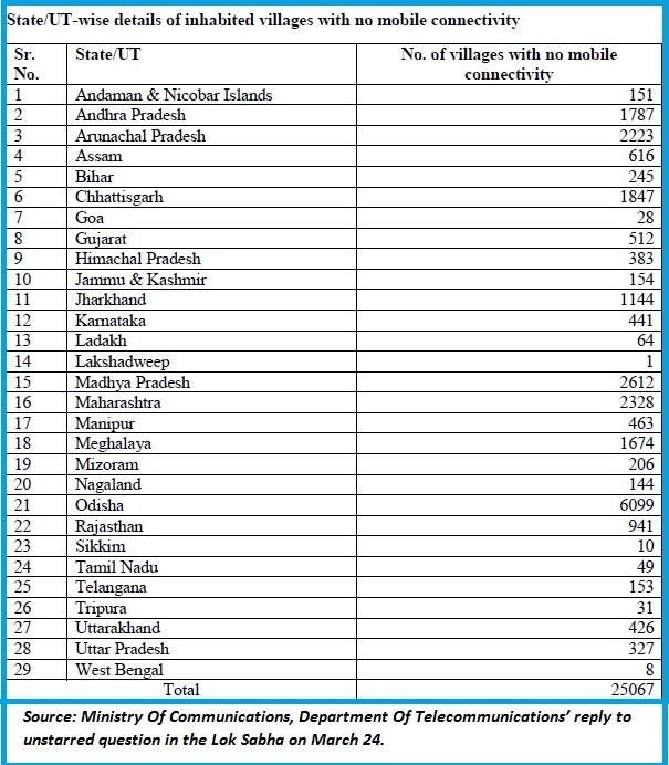 As per the list provided by the MoS in the reply, Odisha had the highest number of inhabited villages without mobile connectivity at 6,099, followed by Madhya Pradesh (2612) and Maharashtra (2328).