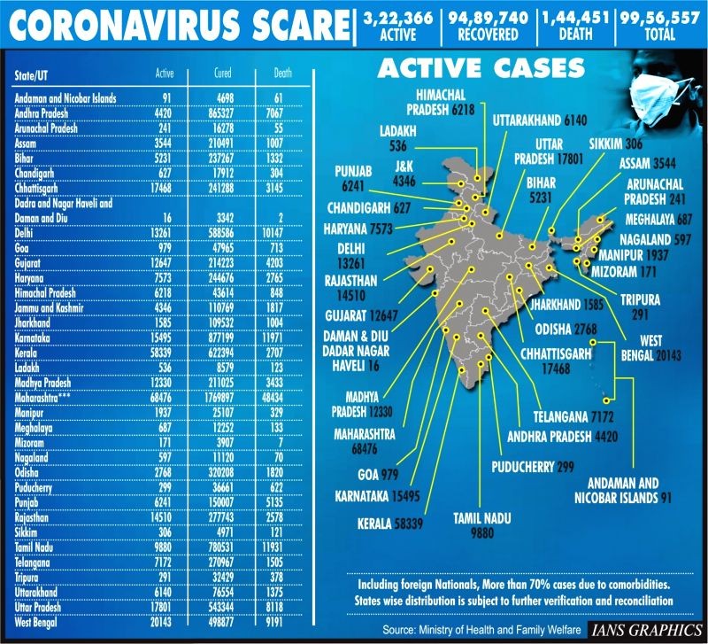 Maharashtra continues to be the worst-hit state with 18,80,893 cases till date. Over 70 per cent of the daily new cases were being reported by 10 states and union territory and in a random order they are Kerala, Maharashtra, West Bengal, Delhi, Chhattisgarh, Uttar Pradesh, Karnataka, Tamil Nadu, Gujarat, Madhya Pradesh.