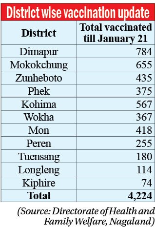 KOHIMA, JANUARY 21 (MExN): 254 health care workers were vaccinated in Nagaland on January 21 bring the total number of vaccinated in the State to 4,224.