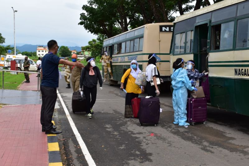 Altogether 280 people reached Dimapur by flight on June 17. Out of 280 people, Air India brought 130 from Kolkata, 30 from Guwahati and 37 from Imphal while Indigo flight brought 83 people from Kolkata. Kohima passengers were sent directly from airport after screening by medical personnel while remaining passengers were taken to Agri Expo for further segregation and transportation to different quarantine centres. (DIPR Photo)