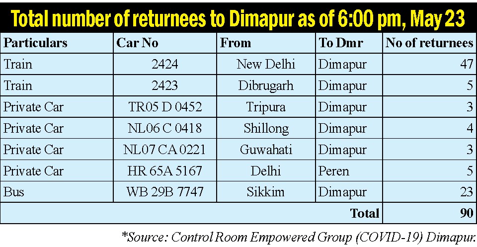 Meanwhile, on Saturday, total of 90 persons arrived in Dimapur via train, buses and private vehicles.