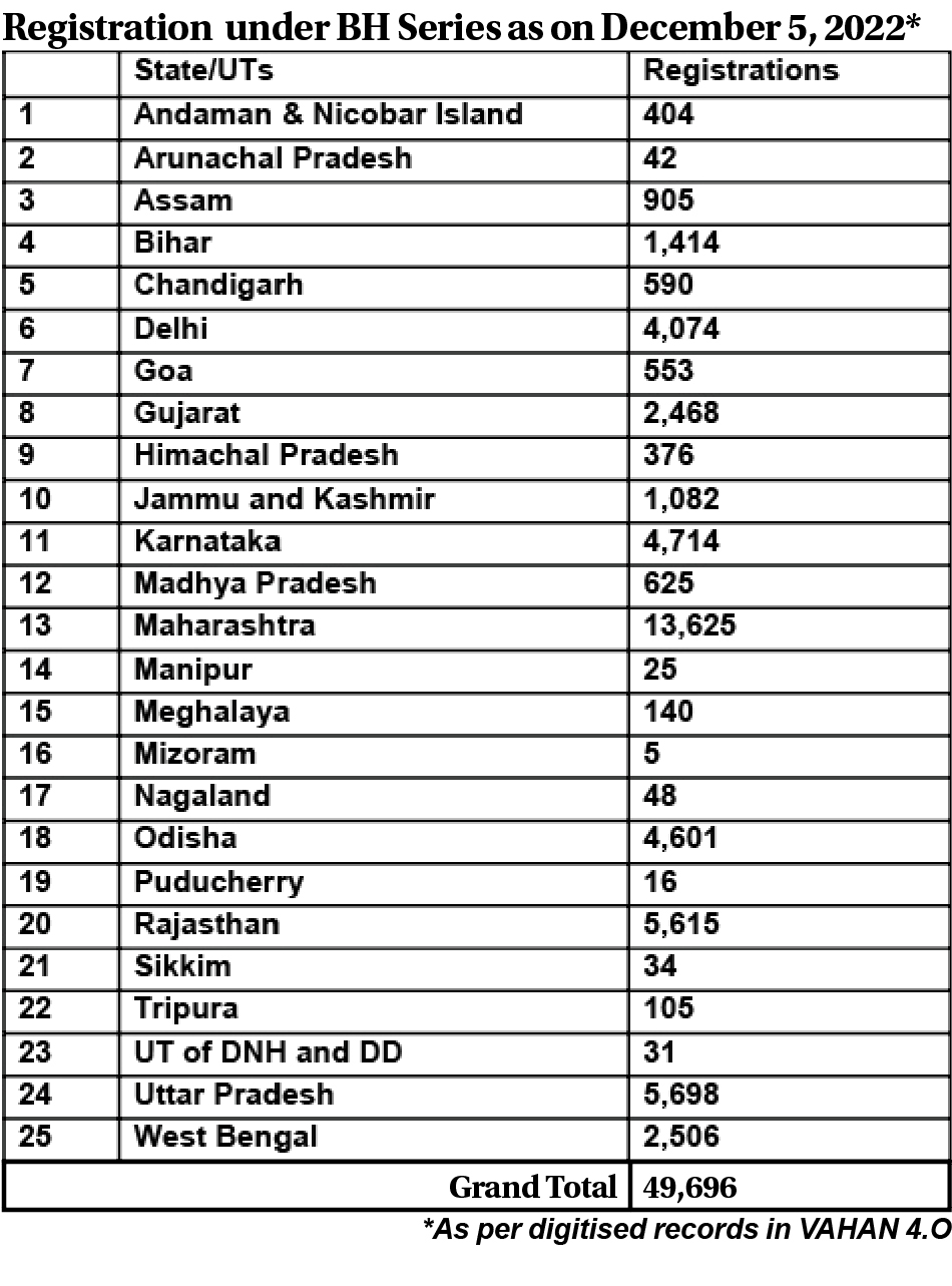 Based on digitised records in VAHAN 4.O, a total of 49,696 have been registered under the BH series, added the written reply given by the MoRTH Minister Nitin Jairam Gadkari in the Lok Sabha on December 15.