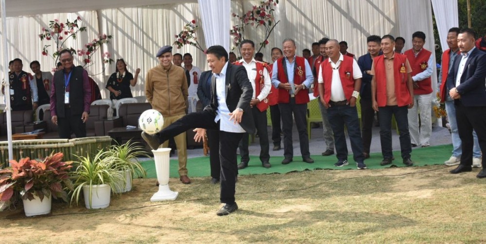 Minister of PHED and Cooperation, Jacob Zhimomi kick starts the KASA Kükami Trophy at Sahoi Village in Niuland on November 23.