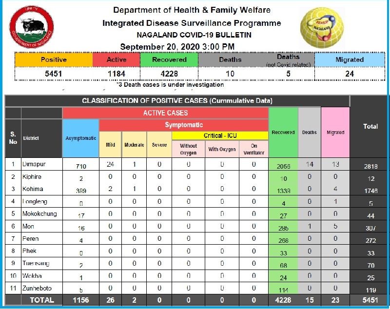 Nagaland registered 59 new COVID-19 cases on Sunday, taking the State’s tally of positive cases to 5451. According to an update from State Health minister S Pangnyu Phom, out of the 59 cases, 45 were in Dimapur and 14 in Kohima. Meanwhile, 68 recoveries were reported in Dimapur, 7 in Kohima, 2 in Mon and 1 in Tuensang on Sunday. The daily total of 78 recoveries added to the recovery tally which rose to 4228. With this, the number of active cases in the State was 1184 as on September 20. According to the Nagaland COVID-19 bulletin, the State has registered 10 deaths so far, while 5 deaths have been categorized as ‘not COVID related’.