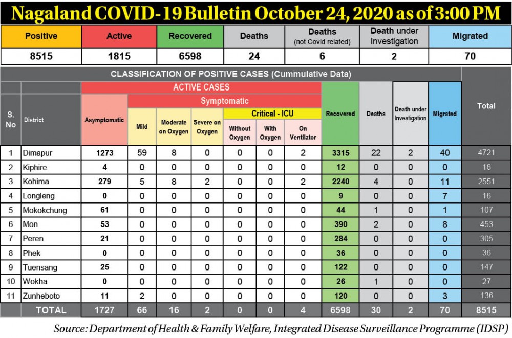 Dimapur, October 24 (MExN): Nagaland's COVID-19 tally rose to 8,515 on Saturday as 79 more people tested positive for the infection, the state Health and Family Welfare Department said.