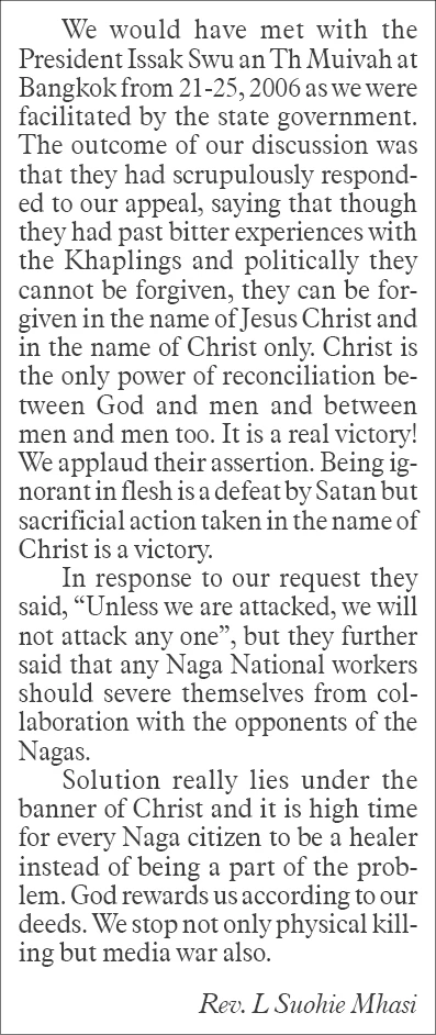 4. Solution lies under the banner of Christ only. Two decades long fratricidal war among the Nagas has been a stumbling block before our neighbours but sacrifice for solution to the conflict for the sake of Christ’s name is a remedy and is a testimony to Christ before the world. In view of this we request that an unconditional declaration of peace be made for the sake of the Nagas. If done so, it would be a great jubilation for the Nagas and a glorification of Gods name. we long to see that our people heave a heavy sigh of relief and have a ray of hope for better understanding, peace and fulfillment of the dream of Nagas unity and Christ be lifted high through you instrumentally.